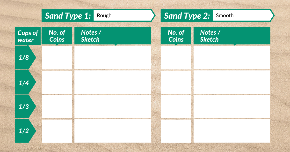 - Repeat this with 1/2 cup of each type of sand and with 1/4 cup, 1/3 cup, and 1/2 cup of water.
