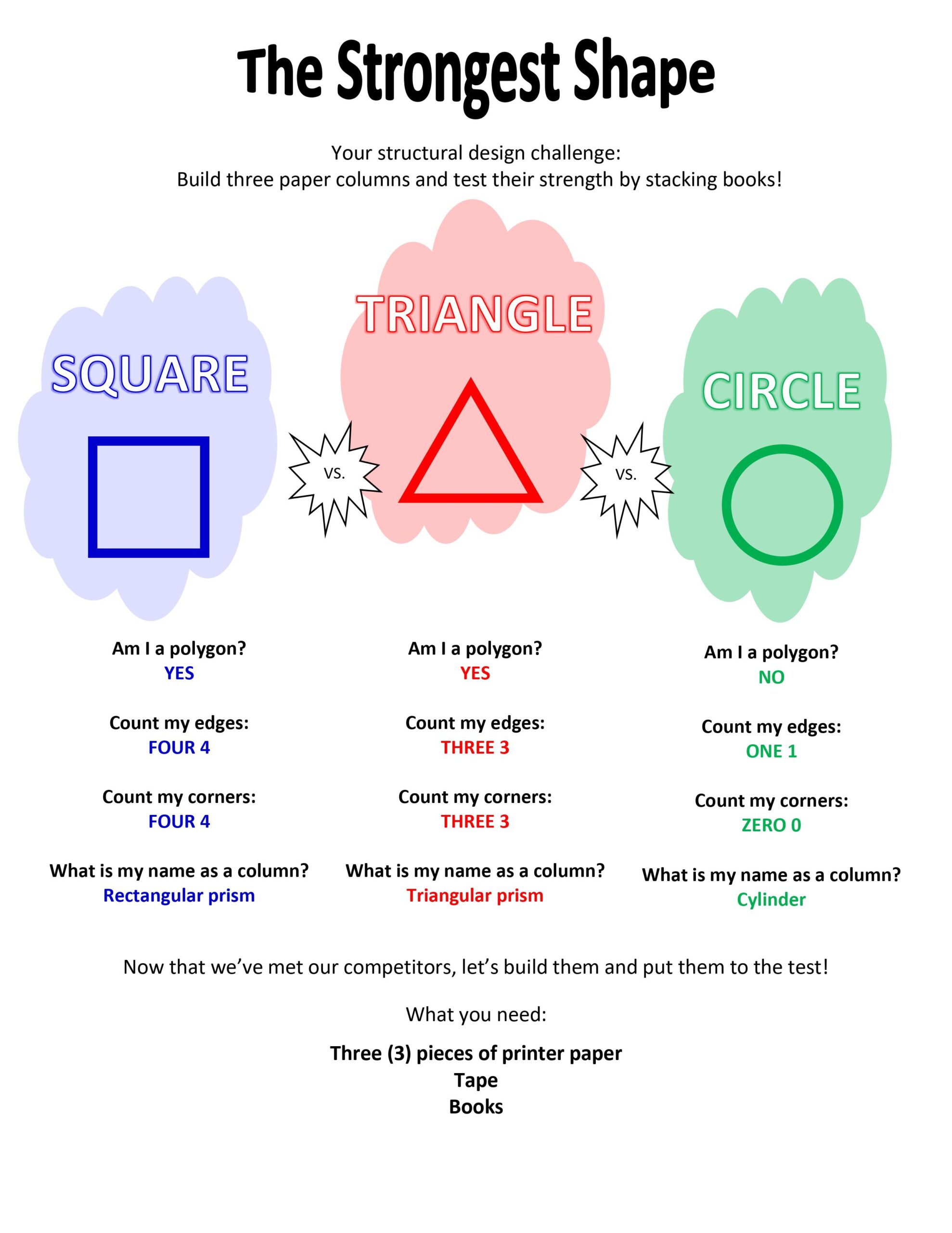 Watch the video to get visual instructions on how to build each of the shapes and test out their strength!