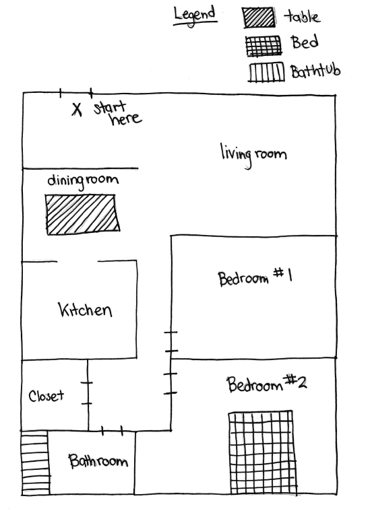 Below is an example of a map of an apartment, showing where to find a table, bed and bathtub from the front door.