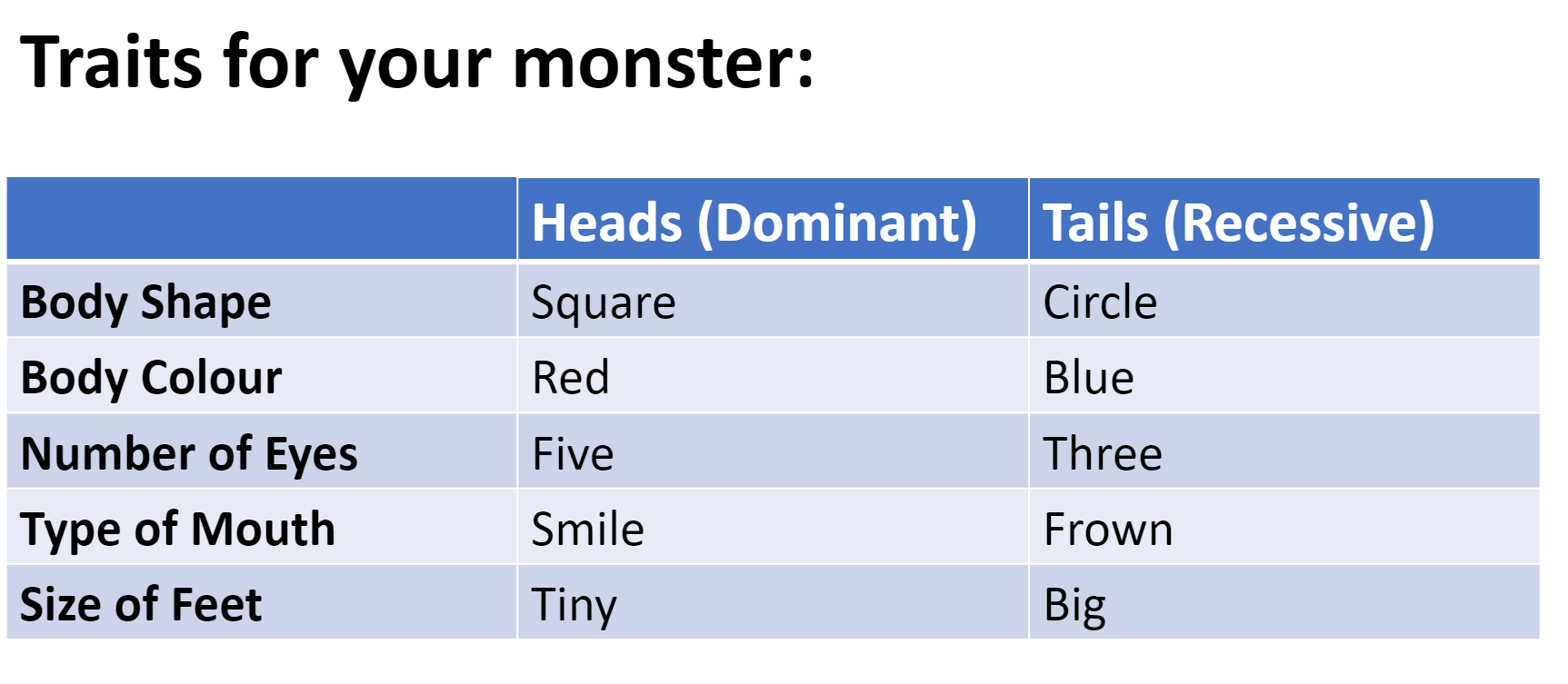 - Step 2: If you land on heads, draw the respective dominant trait for your monster. If you land on tails, draw the respective recessive trait for your monster.