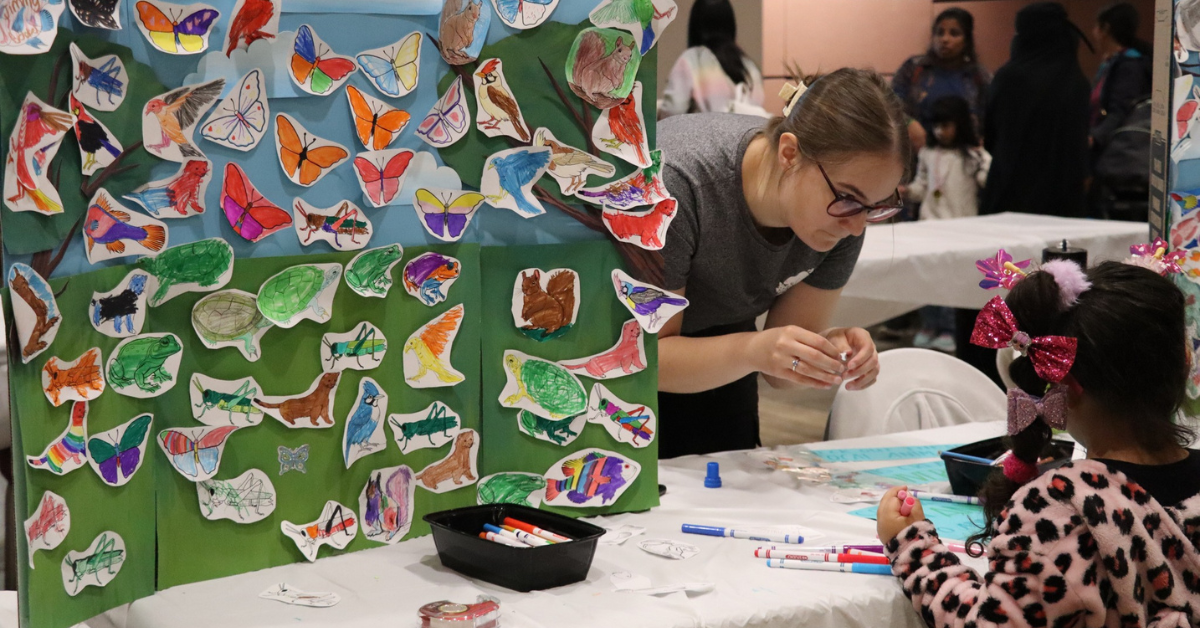 SMArt Communications Student Coordinator Grace Dycha helps a young visitor add their species to the ecosystem board at Science Rendezvous Windsor.